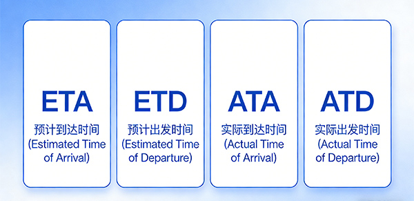 ETA(Estimated Time of Arrival):预计到达时间。这是你最常听到的,船公司预估船什么时候到港。但这个时间会变,风浪、堵港、罢工都会影响,所以只能参考,别当死命令。